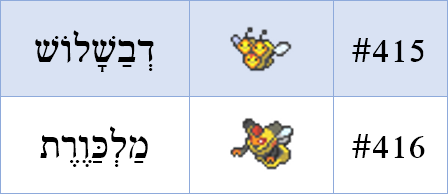היום יש לנו דבורים. הדבורה הראשונה היא Combee, הלחם של Honeycome (חלת דבש, יערת דבש) לצד Bee (דבורה), וכמובן המילה Combination (שילוב, חיבור, צירוף), וביפנית mutsuhanii, הלחם של mitsubachi (דבורת הדבש), המילה mitsu (שלוש) ו-Honey (דבש). אפשר להלחים את דבורה עם צירוף (דבורוף או צירה), אפשר להלחים את דבורה וחיבור (חיבורה), או לעזוב את הדבורה ולהלחים דווקא את דבש ושלוש, מה שיהיה תרגום אחד לאחד של השם היפני (דבשלוש). אפשר לדחוף את האות רי"ש לשם (דבשלורה או דברשלוש…) אבל זה כבר מסורבל ולא מובן, אז נישאר עם דבשלוש.