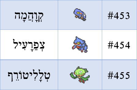 ברמה 37 הקווהמה מתפתחת לצפרדע בשם Toxicroak, הלחם של Toxic (רעיל) לצד Croak (קרקור), או ביפנית dokuroggu, הלחם של doku (רעל) ו-Frog (צפרדע), ובעברית נלחים את צפרדע ורעל לצפרעיל.