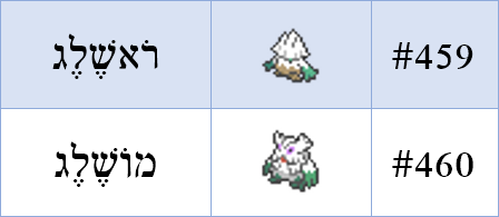 היום אנחנו מסתכלים על Snover, הלחם של Snow (שלג) ו-Cover (מחסה, הסוואה, מסתור), מפני שזו כיסלצת שמסתתרת בשלג. ביפנית קוראים לה yukikaburi, הלחם של yuki (שלג) ו-kaburi (ראש). התרגום יהיה קל הפעם אם נלחים את ראש ושלג ונקבל ראשלג.