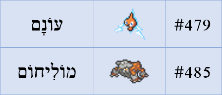 הבוקר דילגנו על 18 כיסלצות שהן התפתחויות של דורות קודמים, והגענו ישר אל אזור הכיסלצות האגדיות והכמעט-אגדיות, ונתחיל עם Rotom (ביפנית rotomu), רוח חשמל מסתורית שיכולה להיכנס כדיבוק לתוך מכשירים חשמליים. השם Rotom הוא המילה Motor (מנוע) במהופך, אז נהפוך את המילה מנוע ונקבל עונם. עכשיו תראו איזה פלא, עונם זה גם הלחם של עונה+נם, מי שמנמנם בתוך מכשירים חשמליים, אבל כן עונה בכך שהוא מפעיל אותם.