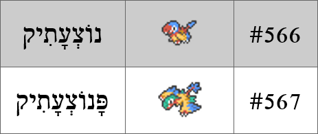 ברמה 37 הנוצעתיק מתפתחת ל-Archeops (ביפנית aakeosu), השם הקודם לצד ops (סיומת לטינית נפוצה לדינוזאורים שאומרת פנים או פרצוף), או ביפנית aakeosu, עם המילה הלטינית archaios (עתיק), או Chaos (אי סדר, בלגן, תוהו ובוהו). נוסיף למילה נוצעתיק את פנים ונקבל פנוצעתיק, כשהשם נוצתוהו (נוצות+תוהו ובוהו) היה מאוד קרוב להיבחר.
