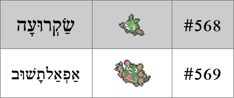 ברמה 36 מורידים את הזבל והכיסלצת מתפתחת ל-Garbodor, הלחם של Garbage (זבל, אשפה, פסולת) לצד Hodor ממשחקי הכס— לצד Odor (ריח, ניחוח), וביפנית dasutodasu, הלחם של Dust (אבק) ו-dasu (להוציא, לייצר), לצד המשפט המפורסם "Dust to Dust", השאלה לשונית למוות. שימו לב, שימו לב. נלך לספר בראשית, פרק ג', פסוק י"ט, וניקח את סוף הפסוק: "כִּי עָפָר אַתָּה וְאֶל עָפָר תָּשׁוּב", שהוא ללא ספק המקור למשפט האנגלי "Earth to earth, ashes to ashes, dust to dust," שנפוץ בהלוויות אמריקניות, נשנה קצת את המילים "עפר תשוב", ונקבל את השם המסתורי אפאלתשוב, שילוב של המילים אף+אל+תשוב. את עוד שקית זבל מסריחה – אז לכי ואל תחזרי.