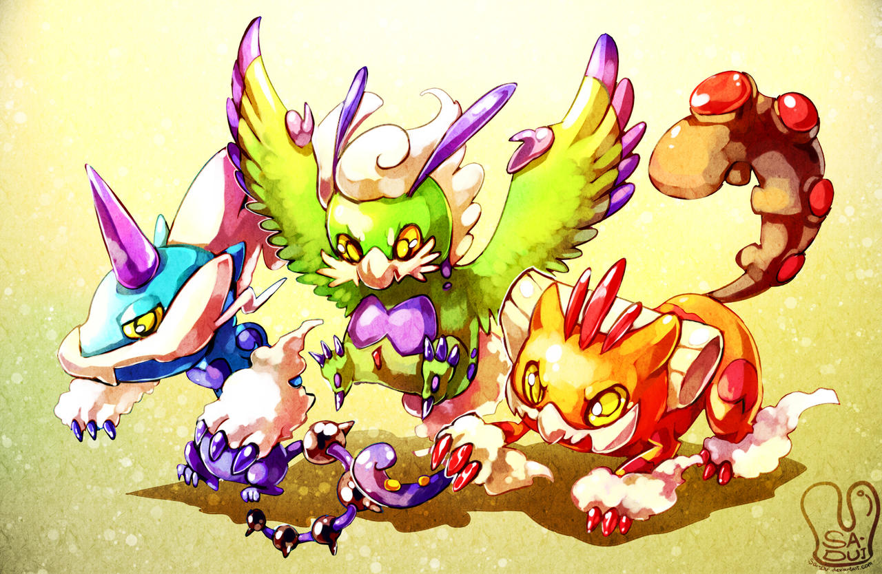 השמות הם Tornadus (ביפנית torunedosu, איולוס לצד טורנדו), Thundurus (ביפנית borutorosu, מהמילים איולוס ורעם או וולט), ו-Landorus (ביפנית randorosu, מהמילים איולוס ואדמה).