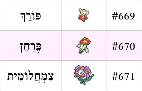 ברמה 19 הכיסלצת תתפתח ל-Floette (ביפנית furaette), הלחם של Flower (פרח) לצד הסיומת הנשית והמקטינה ette. בעברית התקשיתי למצוא מקבילה, אז הלחמתי את פרח עם חן כדי לקבל פרחן, ולמחמירים פרחיננית.