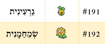 היום יש לנו שני צמחים מאושרים, Sunkern היא הלחם של Sunflower (חמנית) ו-Kernel (גרעין במקרה הזה). ההלחם הראשון שלי היה גרעיניה, אבל אז גיליתי שהשם הנכון יותר לצמח השמש הוא חמנית ולא חמניה (אף שאפשר חמניה), אז עדיף גרעינית, גם אם הפראיים שביניכם יחשבו על פצצה גרעינית. חשבתי לקרוא לה חרצנית במקום, או גלעינית, אבל לאחר שיעור אינטרנט קצת בבוטניקה גרעין זו המילה הנכונה במקרה של חמנית.