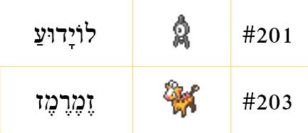 הכיסלצת הראשונה היא Unown, גם באנגלית וגם ביפנית, עיוות של Unknown (לא ידוע). עיוותתי את לא ידוע והפכתי את זה ללוידוע, כי לכיסלצת זה ידוע, אבל לנו לא, אז לוידוע.