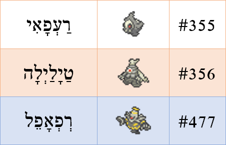 רַעְפָאִי (רע+רוח רפאים) ~> טַיָלַיְלָה (טייל+לילה) ~> רְפְאָפֵל (רפאים+אפל).