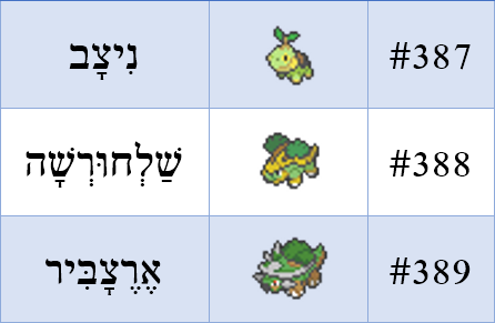 הכיסלצת היומית – דור רביעי! והכיסלצת ההתחלתית מסוג דשא של הדור היא Turtwig, הלחם של Turtle (צב) ו-Twig (ענף), או ביפנית naetoru, הלחם של nae (נבט, ניצן) לצד Turtle (צב). יש לנו שתי אפשרויות מעניינות, צב+נבט נותן לנו צָבֶט, וניצן+צב נותן לנו ניצב. שתי המילים נראות כמו מילים אחרות ולא כמו שם של כיסלצת. מה נעשה? הלחם משולש! ניצן+צב+נבט נותן לנו ניצבט! לא, זה מוגזם. אנחנו נלך ניצב, וזה בסדר אם למילה יש משמעות אחרת.
