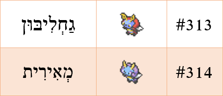 הכיסלצת הראשונה היא הזכר, Volbeat, הלחם של Volt (יחידה מדידת מתח חשמלי) לצד Beetle (חיפושית), וביפנית, barubitto, הלחם של Bulb (נורת להט, נורת ליבּוּן) ו-Beetle (חיפושית).